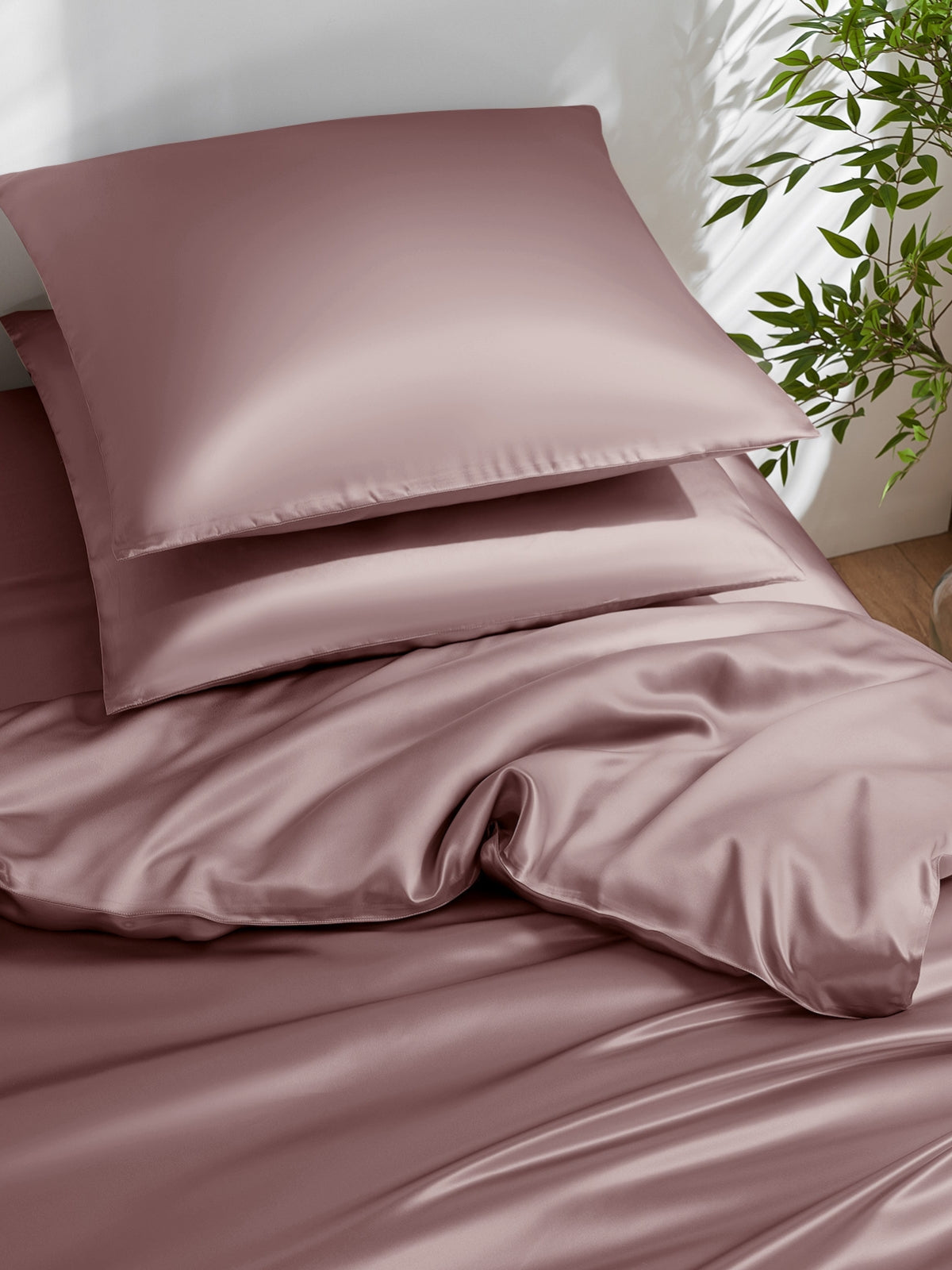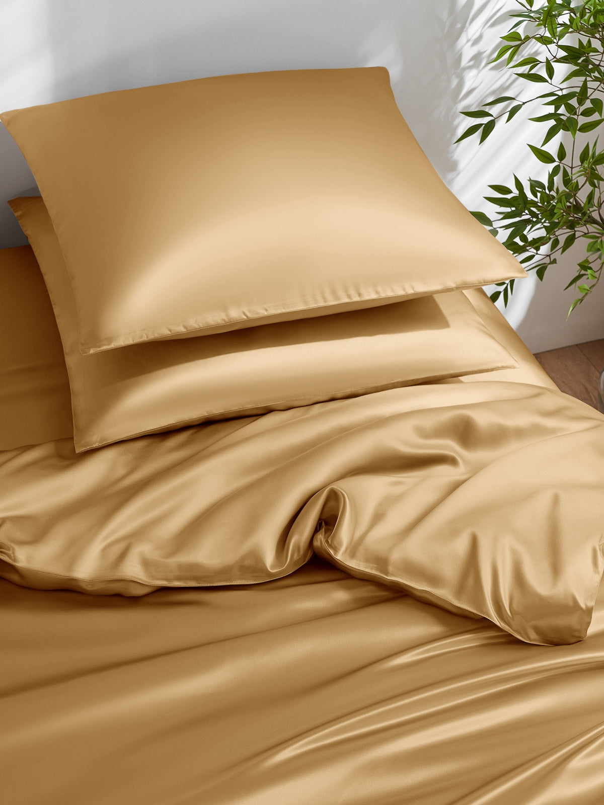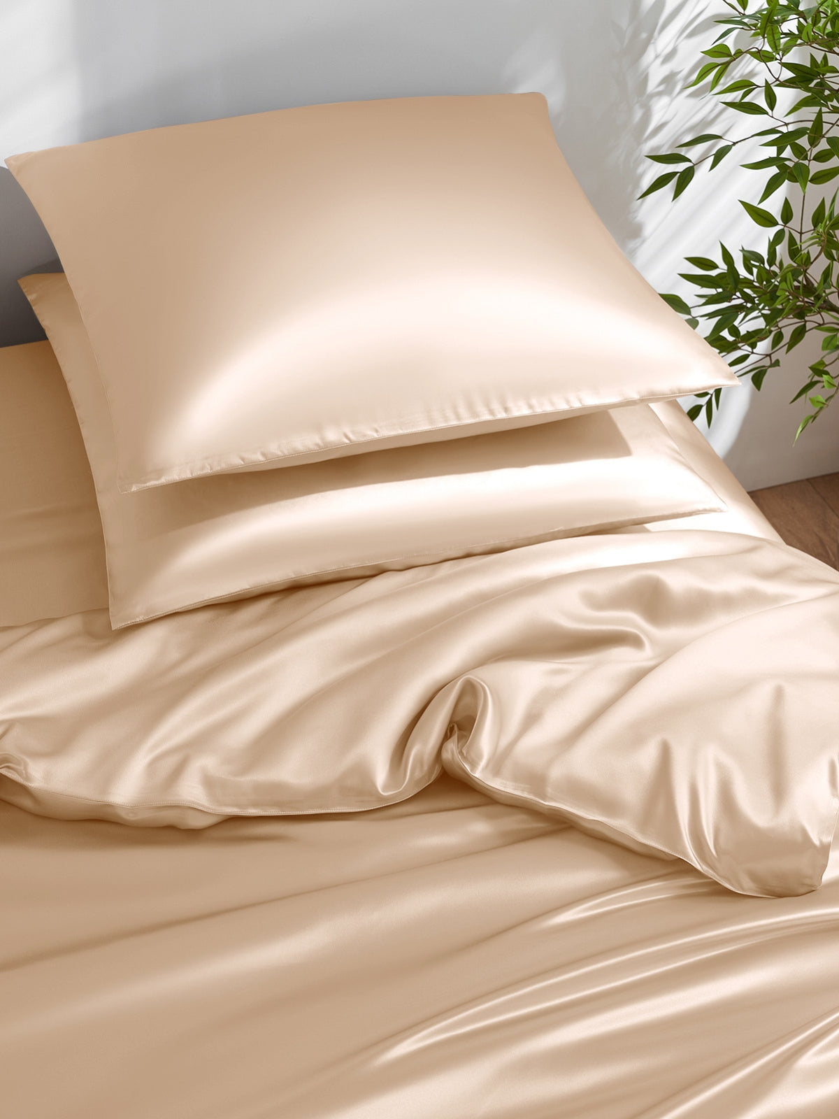Dieser Bettbezug aus 19 Momme-Maulbeerseide ist ein luxuriöses 3-teiliges Set, bestehend aus einem Bettbezug und einem passenden Kissenbezug. Die Seide hat einen zarten und prächtigen Glanz, der jedes Schlafzimmer ergänzt. Es handelt sich um eine hochwertige Seide mit einer Fadenzahl von 400, die aus Sicherheitsgründen auch Öko-Tex 100 zertifiziert ist.