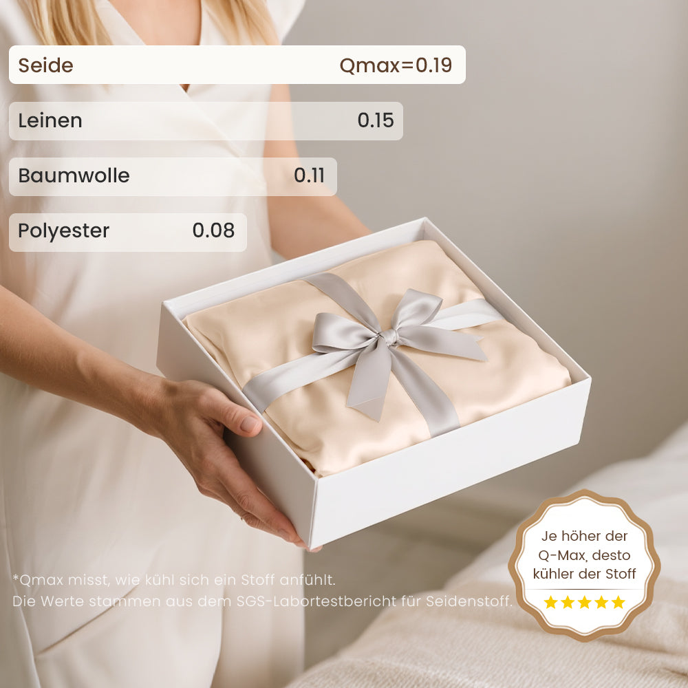 Unsere Seidenbettbezüge werden in einer hochwertigen weißen Geschenkbox geliefert, die jedes Detail unseres Premium-Produkts würdig in Szene setzt. Diese edle Verpackung: