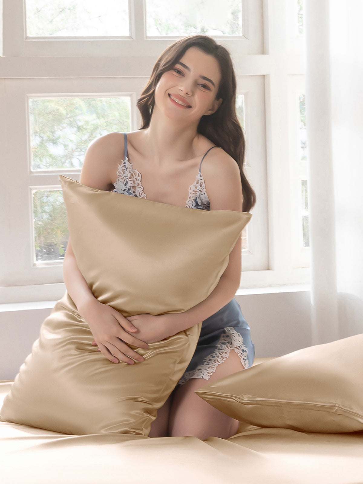 Der 22 Momme Seidenkissenbezug mit Reißverschluss ist perfekt für alle, die ein einfaches und luxuriöses Schlaferlebnis wünschen. Er fühlt sich weich und dünn an, wenn Sie darin schlafen. Einer der Hauptvorteile von Seidenkissenbezügen gegenüber Baumwollkissenbezügen besteht darin, dass sie die natürliche Feuchtigkeit Ihrer Haut bewahren können. So können Sie Ihre Haut und Ihr Haar gesund halten. Keine fettige Haut mehr, keine Akne mehr. Sie können sich auch von Hautfalten verabschieden, da diese bei Seidenkissenbezügen nicht auftreten.
