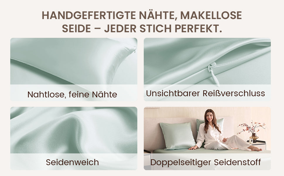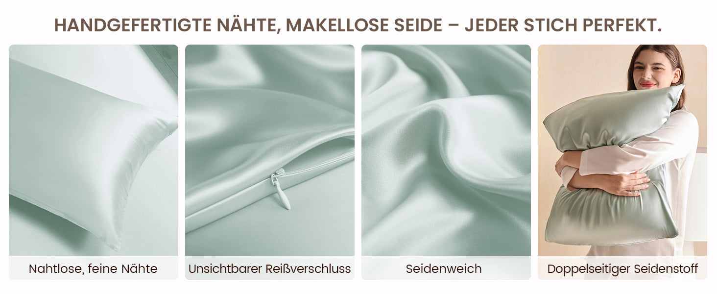 Entdecken Sie, warum ein 25 Momme Seidenkissenbezug die beste Wahl für gesundes Haar ist. Die hochdichte Webstruktur mit dem niedrigsten Reibungskoeffizienten lässt Ihr Haar sanft gleiten. Dies beugt wirksam Haarbruch, Knoten und morgendlichem "Bed Head" vor. Erwachen Sie mit spürbar glatterem, glänzenderem und leichter zu kämmendem Haar – die perfekte, natürliche Haarpflege über Nacht