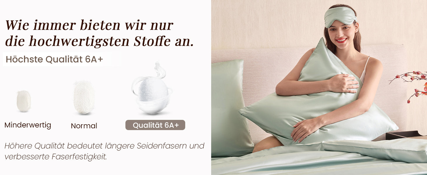 Echte Maulbeerseide ist ein reines Naturmaterial, während Satin eine Webart beschreibt. Seide ist von Natur aus hypoallergen, atmungsaktiv und mit pflegenden Aminosäuren ausgestattet – das macht sie besonders hautfreundlich und ideal für einen erholsamen Schlaf.