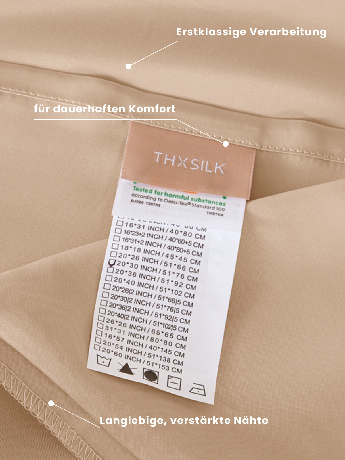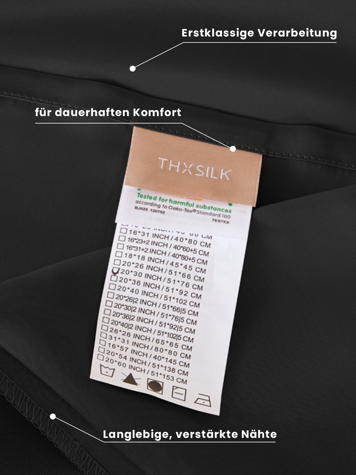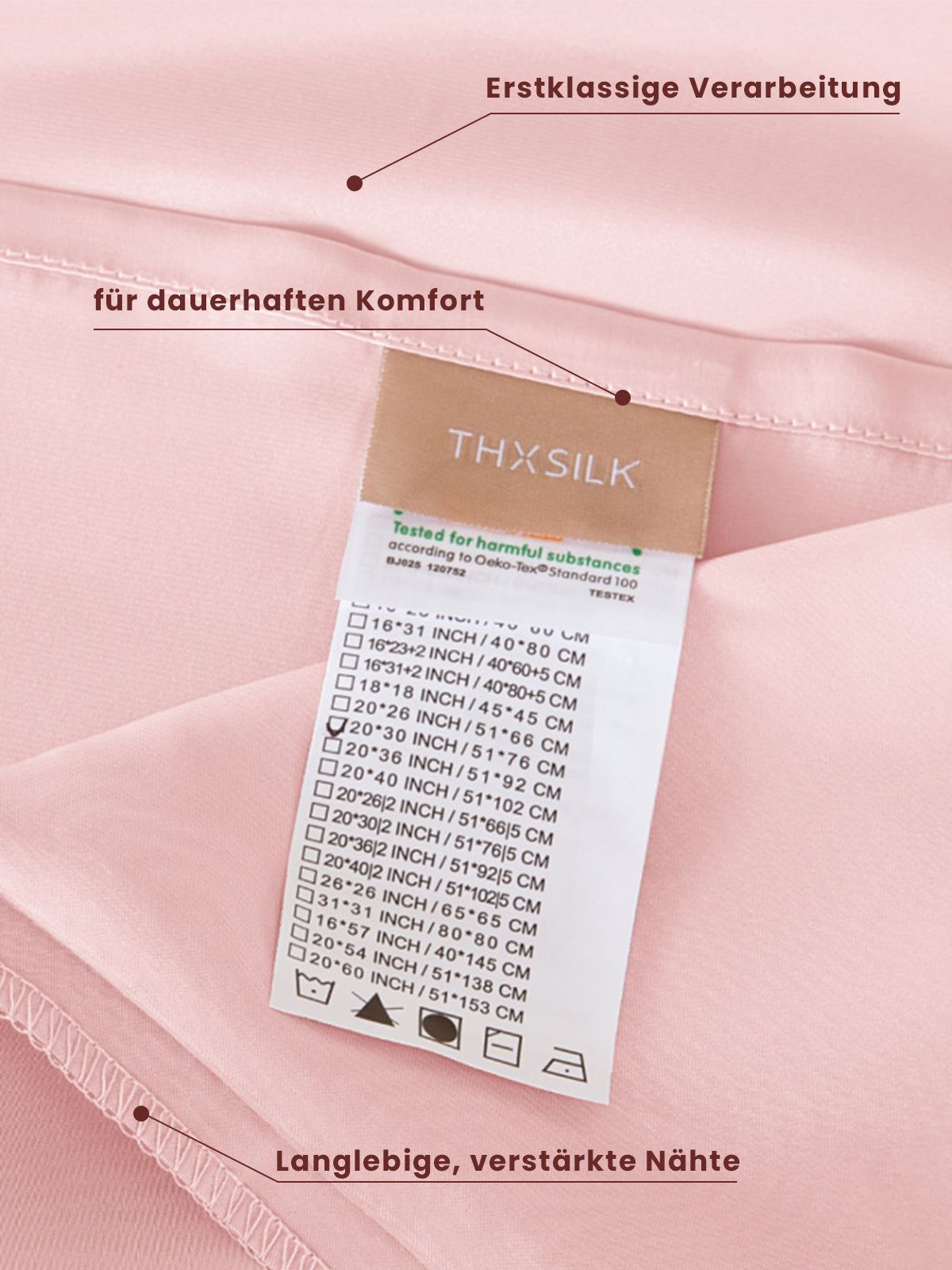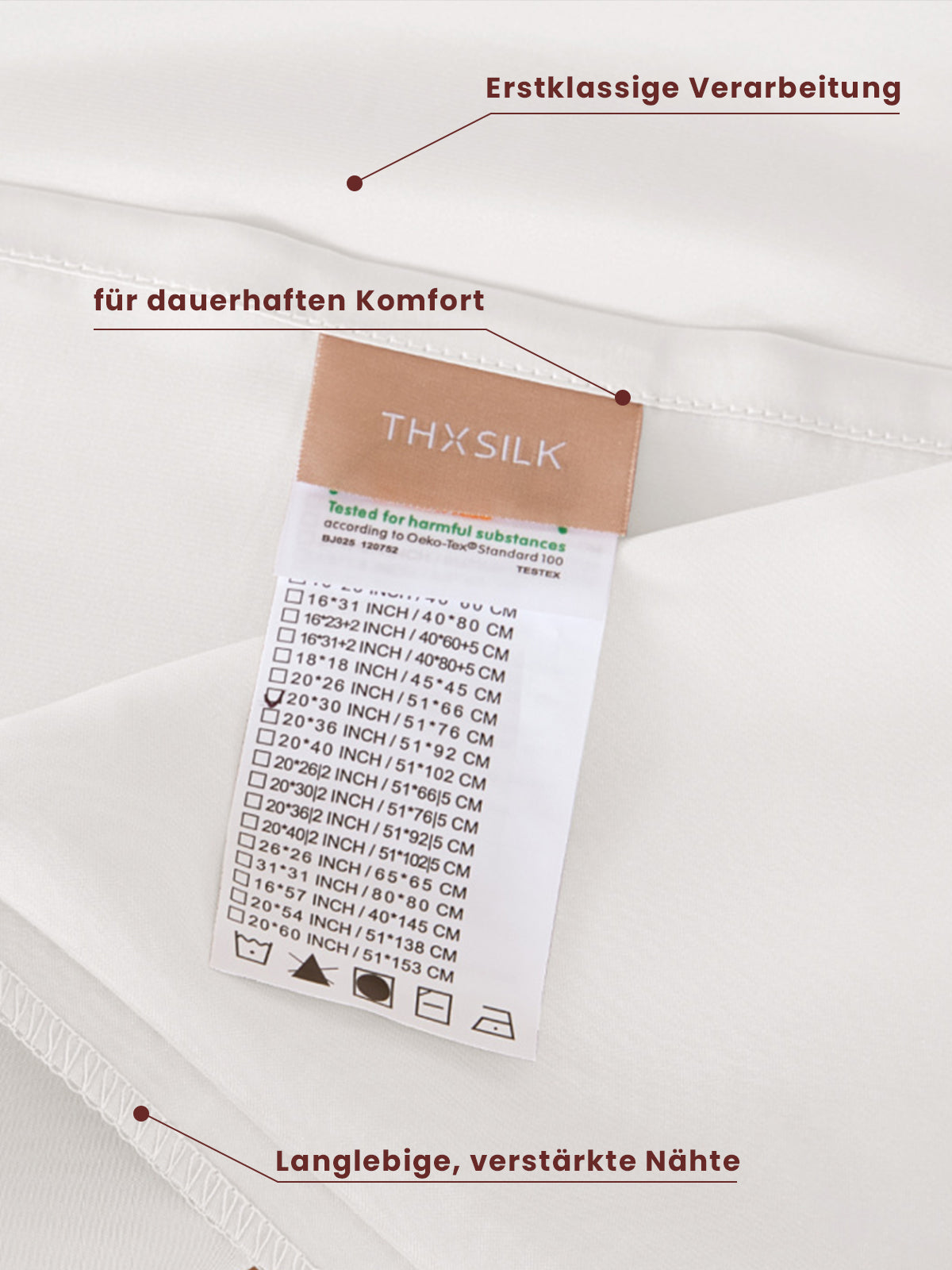 Die 25-Momme-Seidenkissenbezüge von THXSILK bestehen aus 100 % reiner Maulbeerseide. Die hochwertigen Maulbeerseidenkissenbezüge der Güteklasse 6A helfen Asthmatikern und Allergikern und sind für empfindliche Schläfer geeignet. Unsere 25-mm-Seidenkissenbezüge enthalten fast 20 % mehr Seide als die 22-mm-Kissenbezüge. Sie sind waschbar und pflegeleicht. Jedes Detail unserer Kissenbezüge zeigt das Streben nach dem ultimativen Luxusleben.