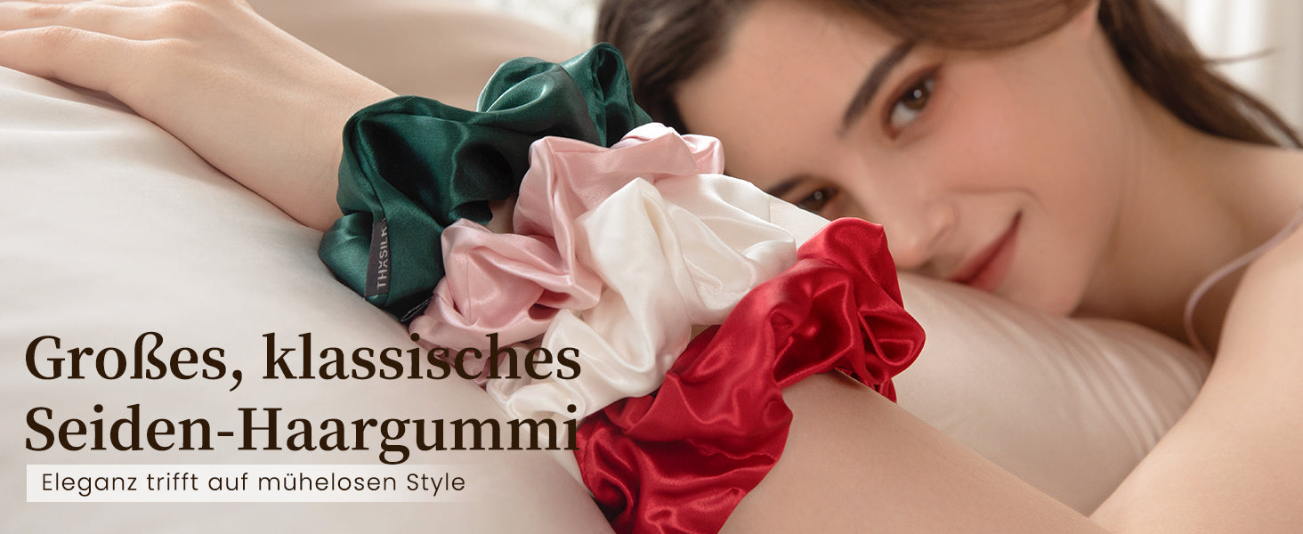 Verwöhnen Sie Ihr Haar mit unseren Haargummis aus 100 % Maulbeerseide. So sieht Ihr Haar immer fantastisch aus – egal ob beim Schlafen oder Stylen.