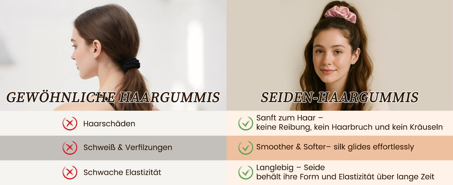 Haargummis aus 100 % Maulbeerseide sorgen für reibungsfreien Tragekomfort. Die Naturfasern bändigen fliegende Haare, reduzieren statische Aufladung und beugen Spliss vor, indem sie sanft und ohne Ziepen über das Haar gleiten. Ideal zum Schutz von Locken oder für elegante Looks. Diese Haargummis verleihen Glanz wie vom Friseur und halten das Haar den ganzen Tag lang mit Feuchtigkeit versorgt und vor Beschädigungen geschützt.