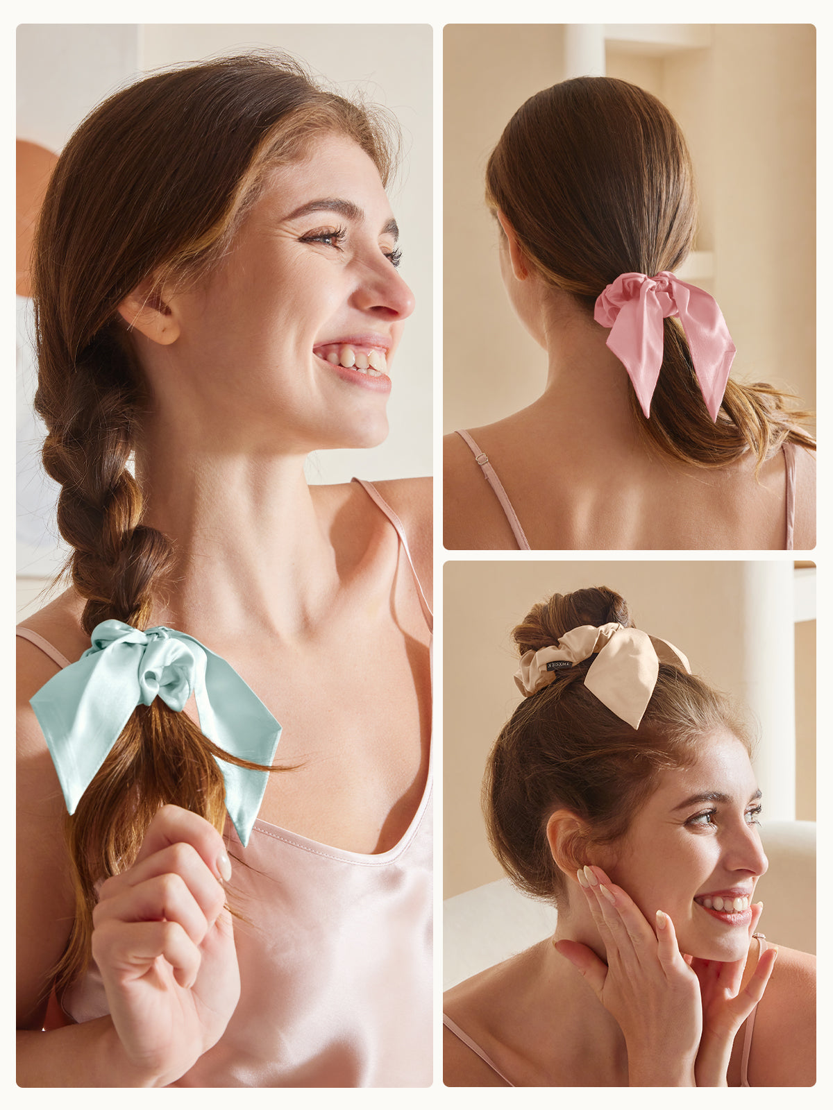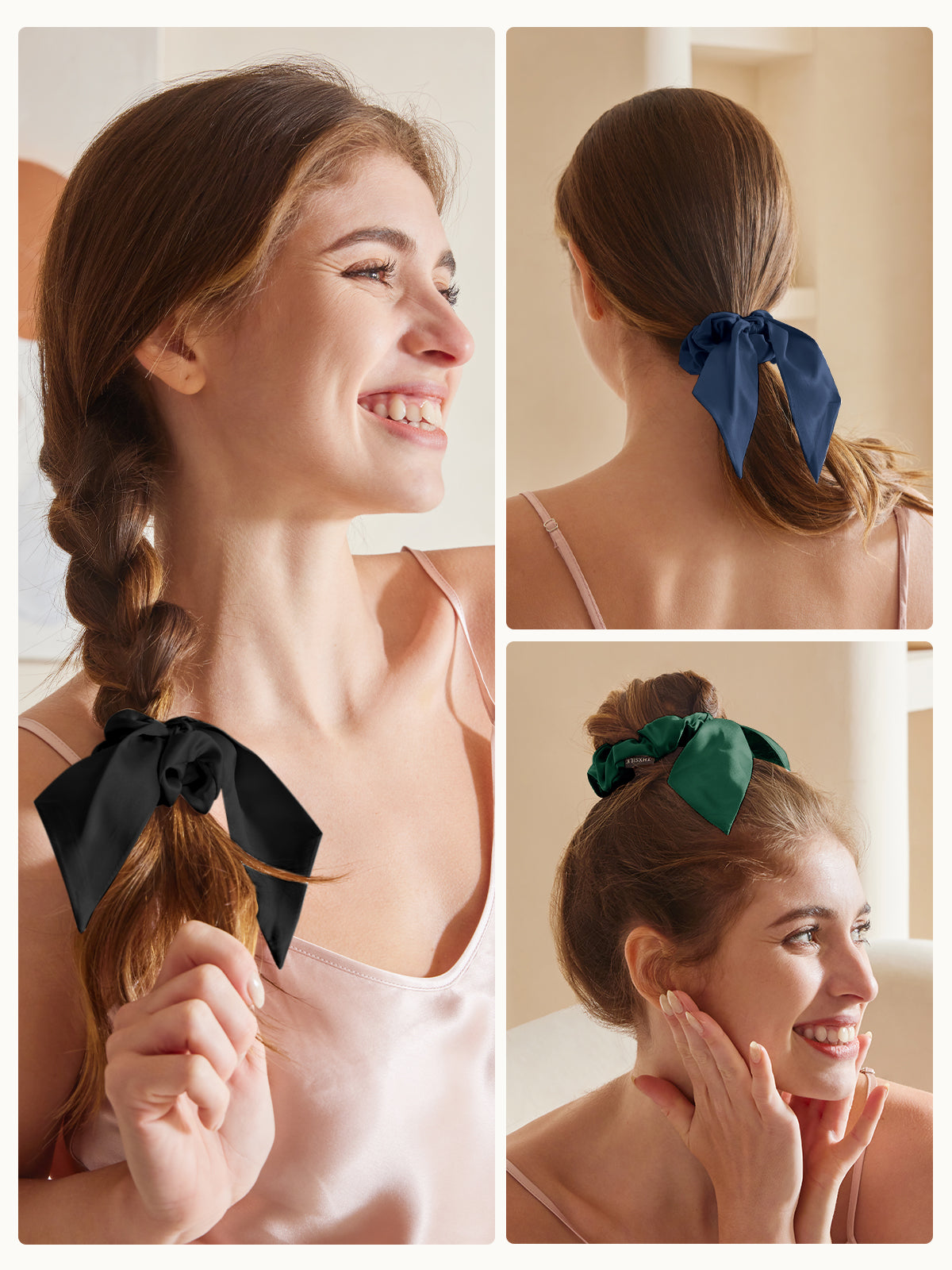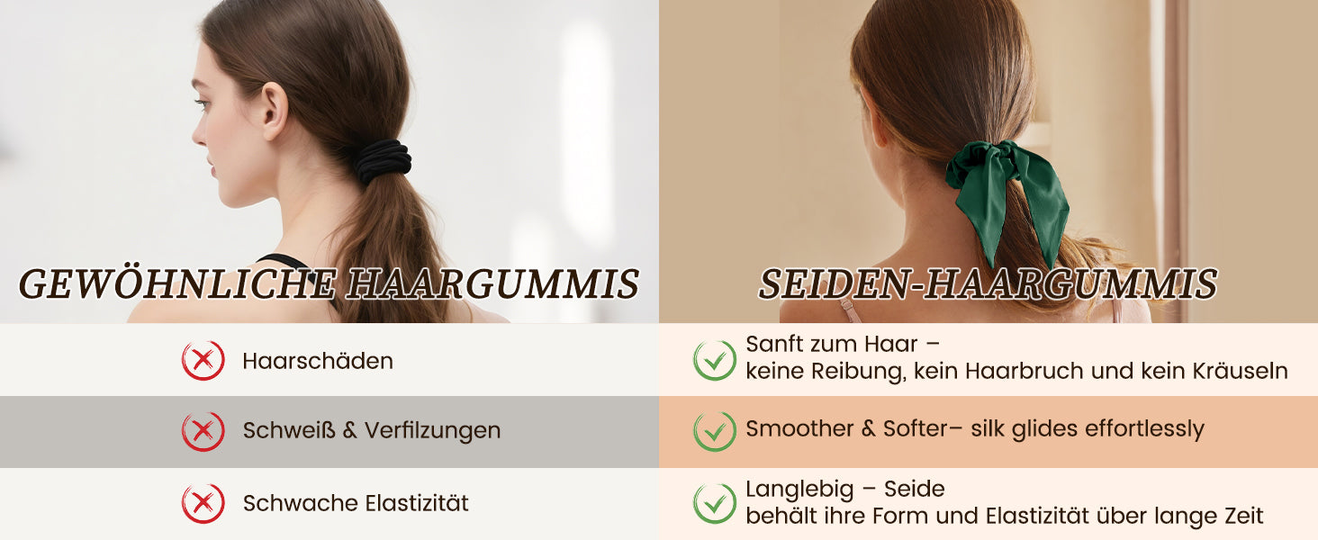Wer sagt, Haargummis könnten nicht hübsch und praktisch sein? Diese Seiden-Haargummis mit ihrer zierlichen Schleife verleihen femininen Flair und bieten alle Vorteile von Seide: kein Frizz, kein Haarbruch – einfach nur schönes Haar! 🌸 Verschönern Sie Ihren Pferdeschwanz oder Dutt im Handumdrehen!