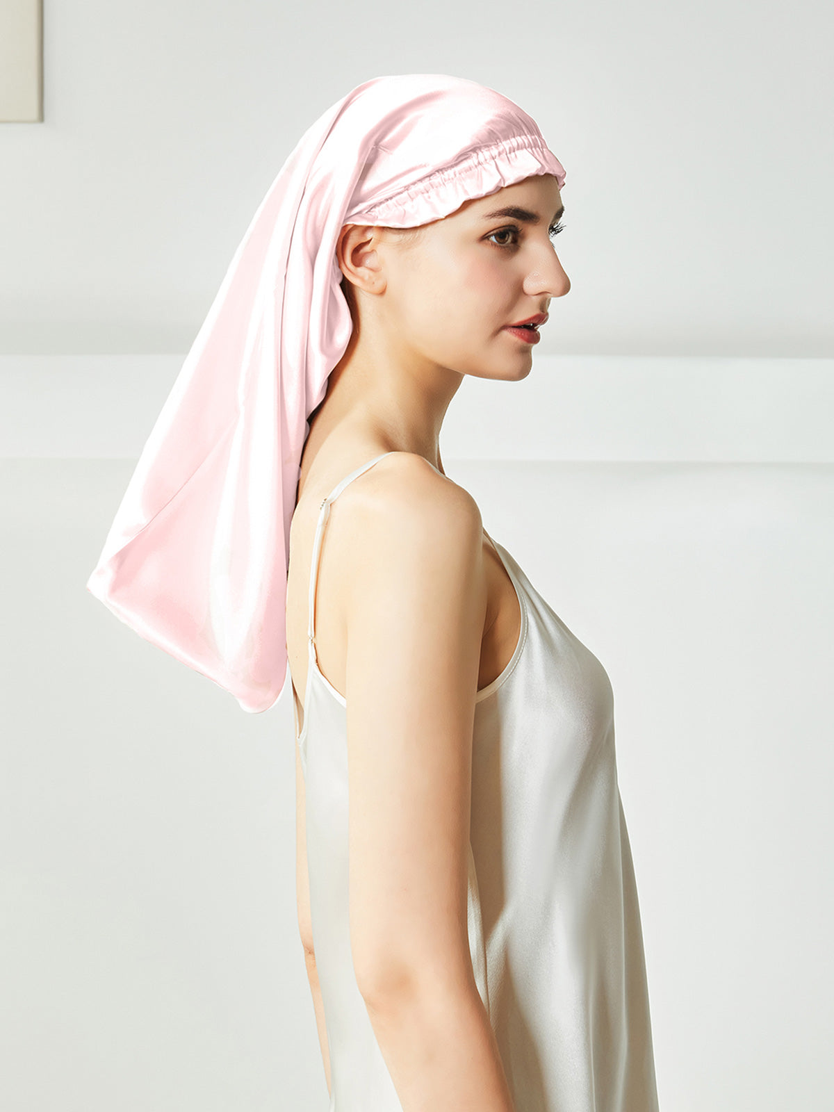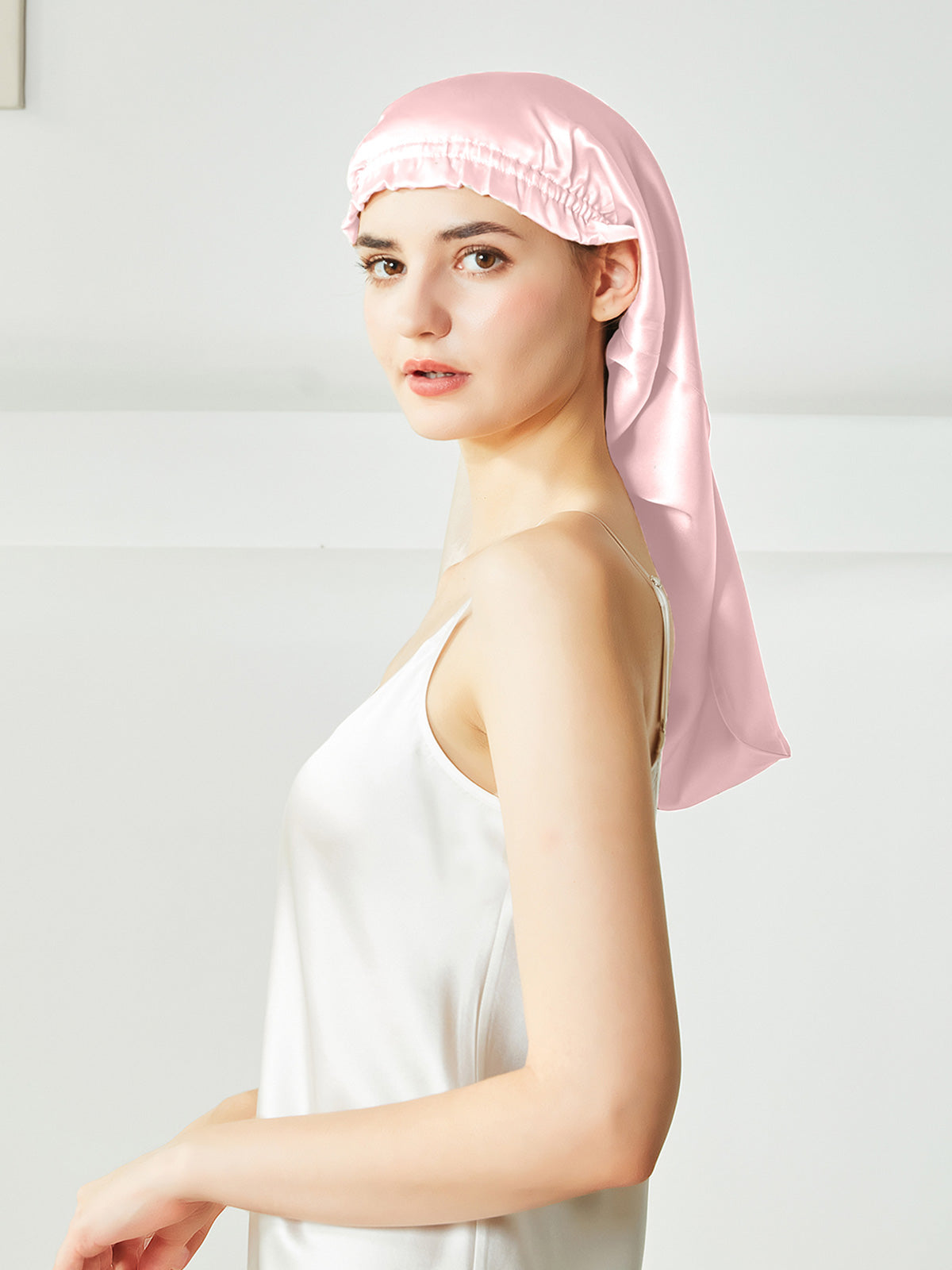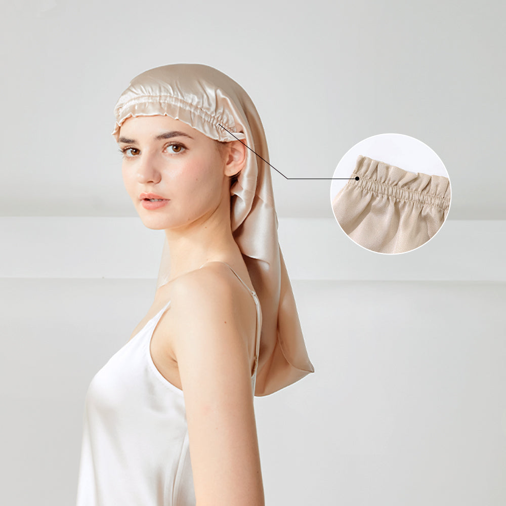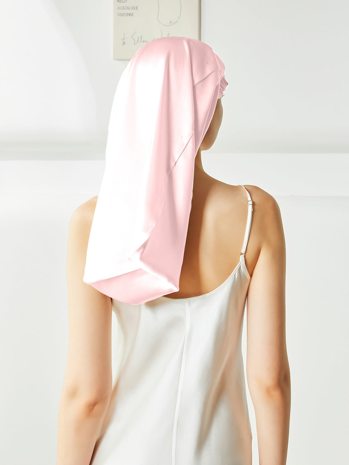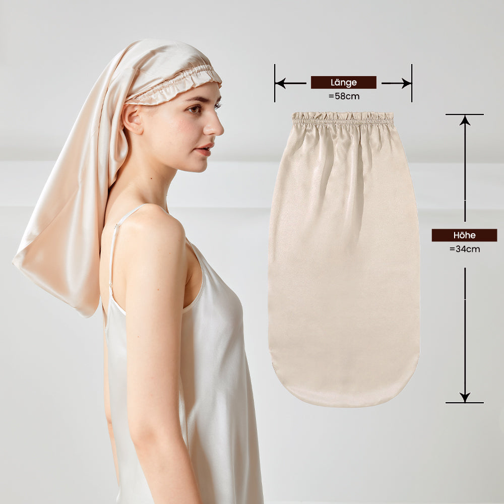 Dies ist eine lange Schlafhaube aus Seide. Sie können Ihr langes Haar ganz entspannt in die Nachthaube stecken, anstatt es wie die kurze Nachthaube auf dem Kopf zu falten, können Sie es vor dem Schlafengehen einfach auf dem Kopf tragen. Seide kann das Haar effektiv mit Feuchtigkeit versorgen, es vor Kräuseln schützen und ist gut für das Haar.