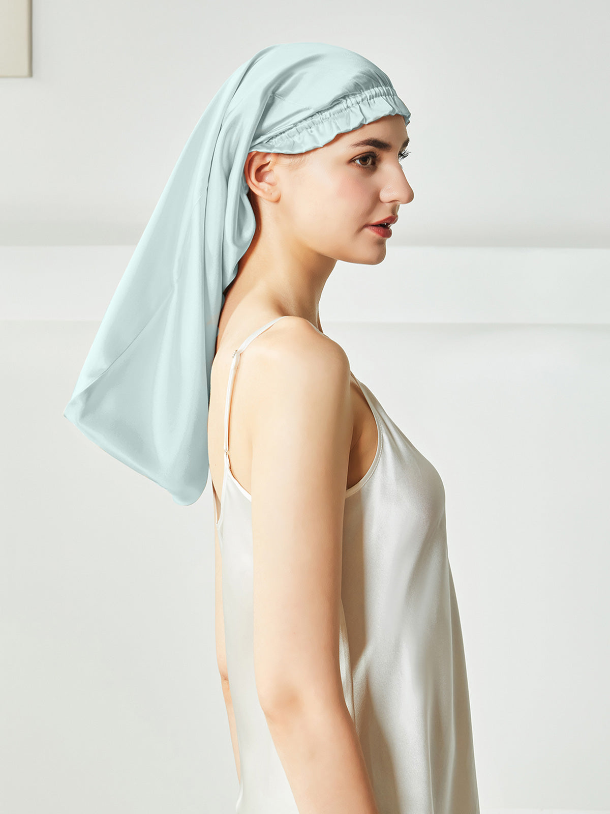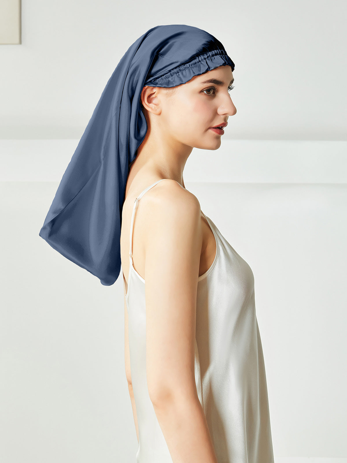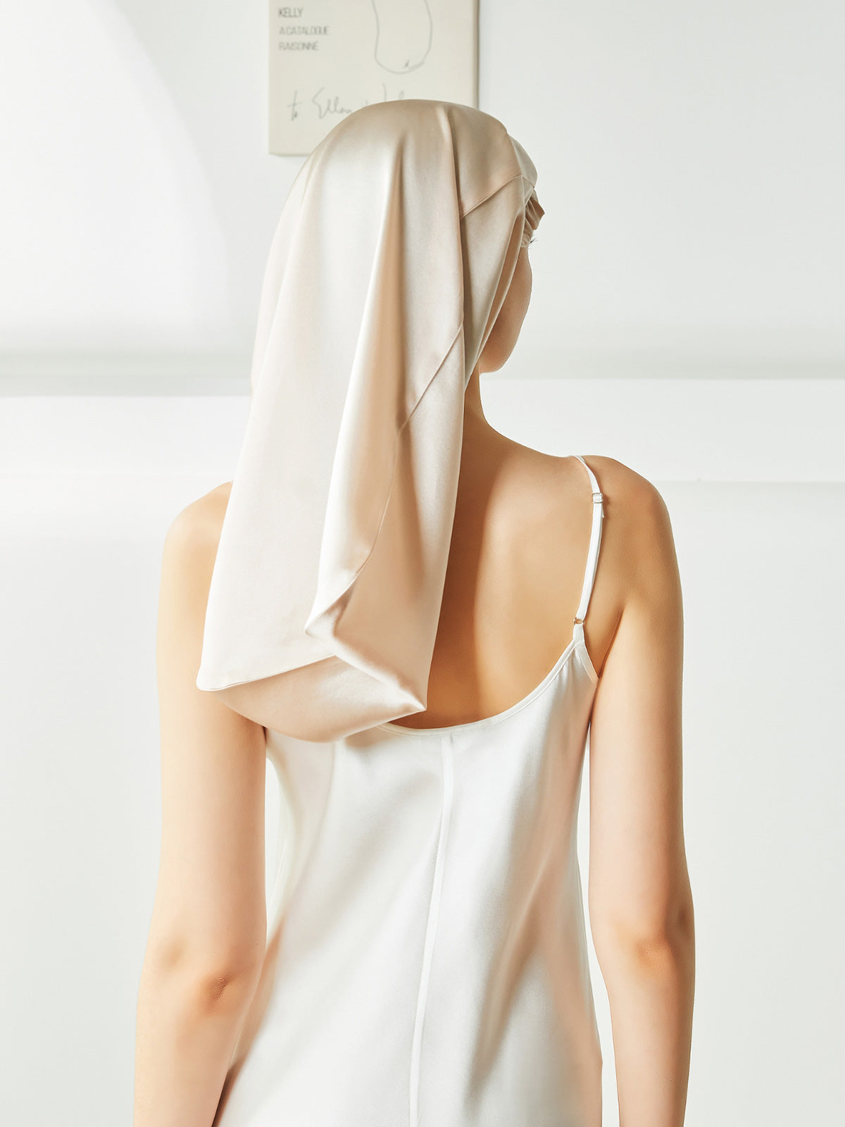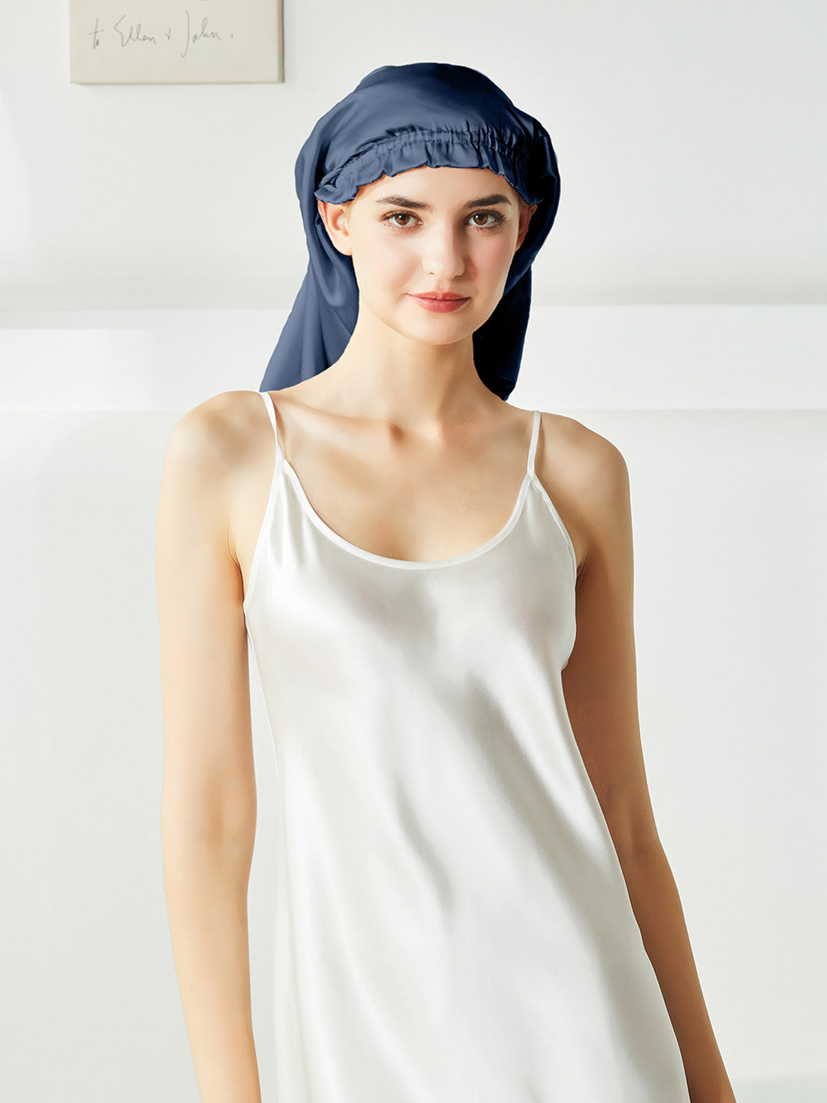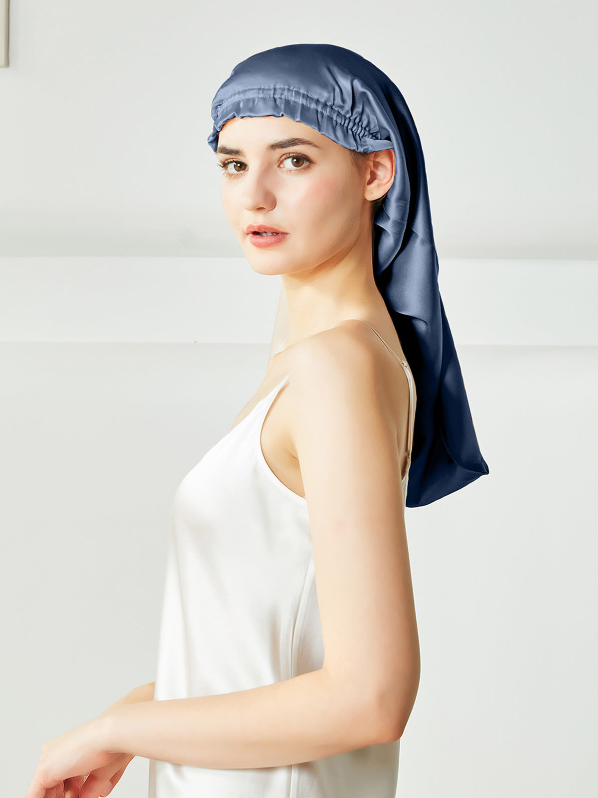 Dies ist eine lange Schlafhaube aus Seide. Sie können Ihr langes Haar ganz entspannt in die Nachthaube stecken, anstatt es wie die kurze Nachthaube auf dem Kopf zu falten, können Sie es vor dem Schlafengehen einfach auf dem Kopf tragen. Seide kann das Haar effektiv mit Feuchtigkeit versorgen, es vor Kräuseln schützen und ist gut für das Haar.