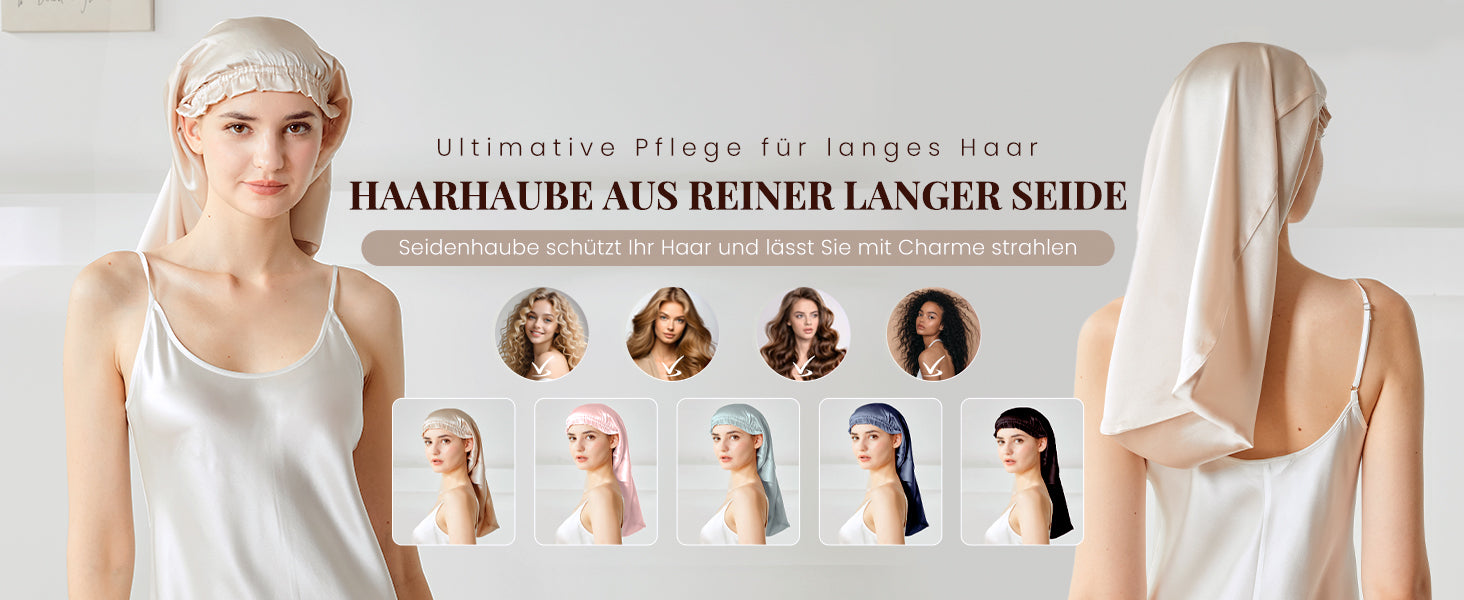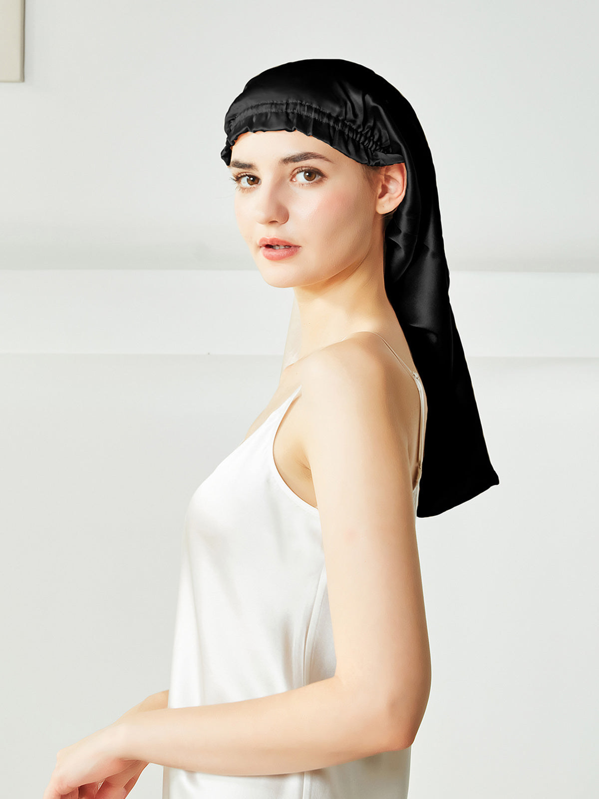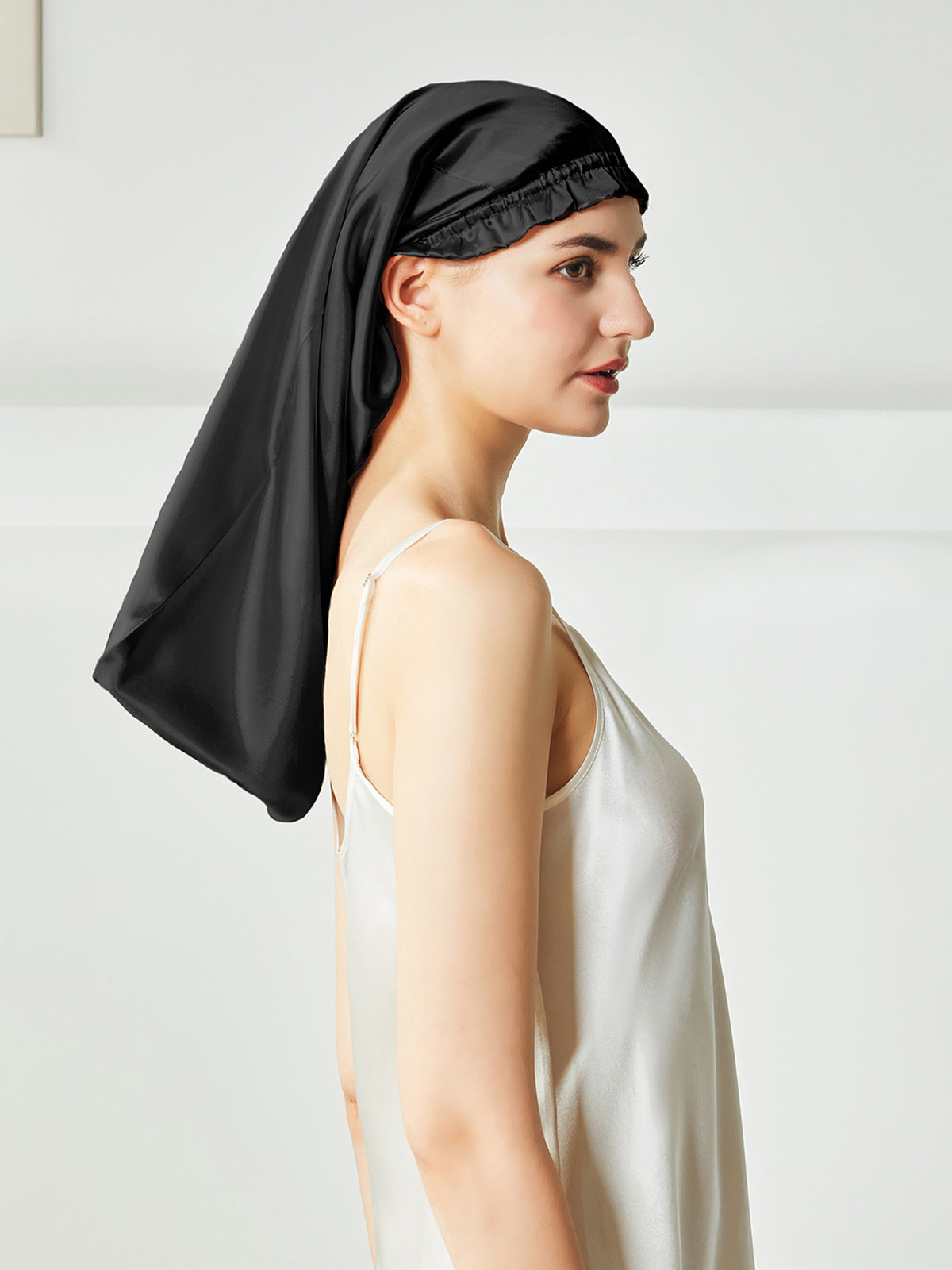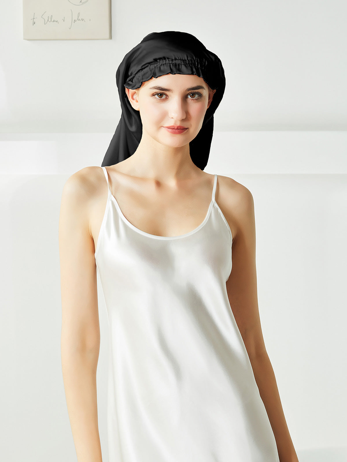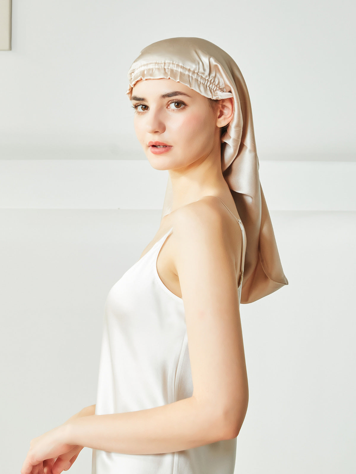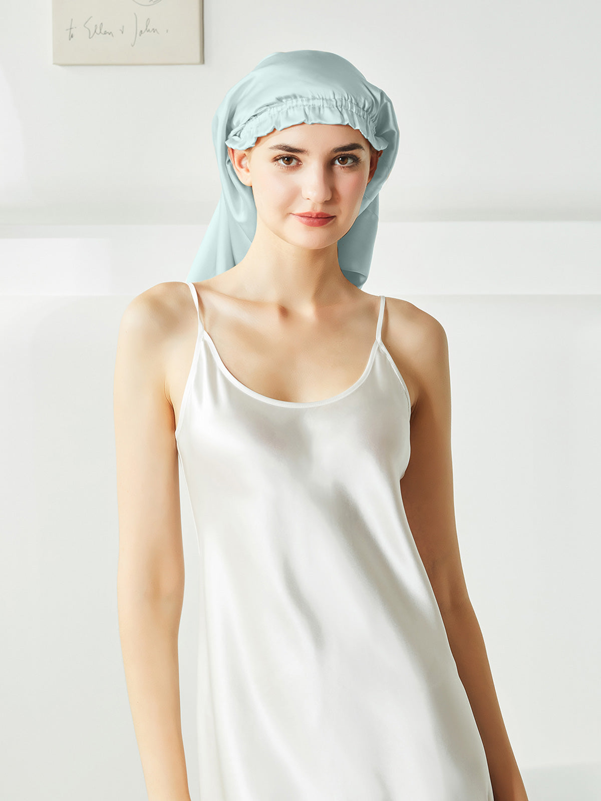 Dies ist eine lange Schlafhaube aus Seide. Sie können Ihr langes Haar ganz entspannt in die Nachthaube stecken, anstatt es wie die kurze Nachthaube auf dem Kopf zu falten, können Sie es vor dem Schlafengehen einfach auf dem Kopf tragen. Seide kann das Haar effektiv mit Feuchtigkeit versorgen, es vor Kräuseln schützen und ist gut für das Haar.