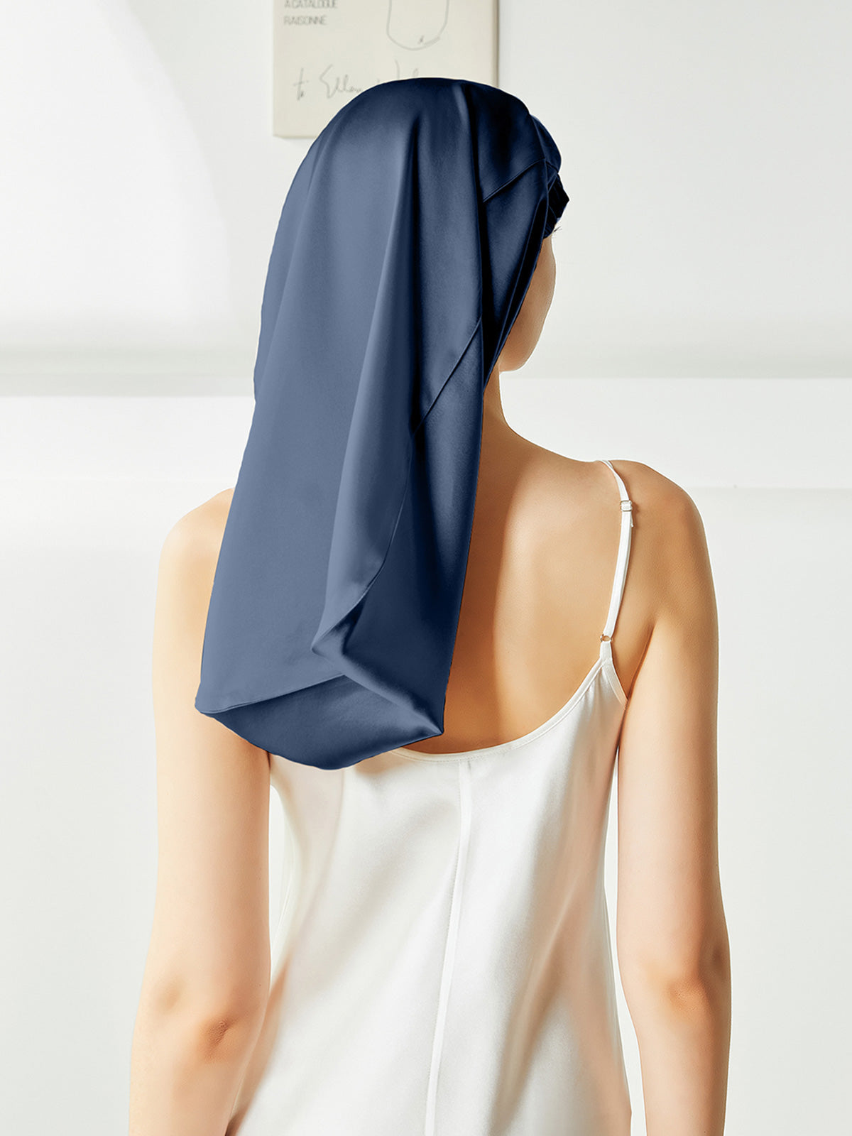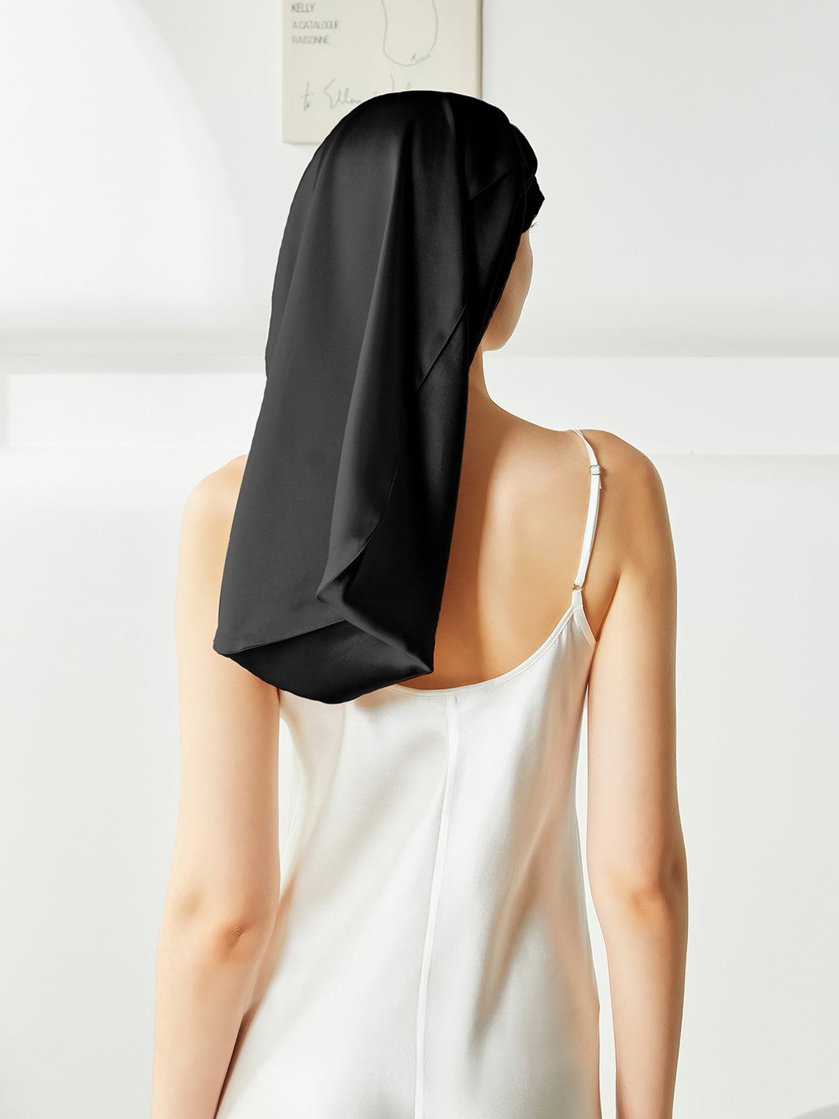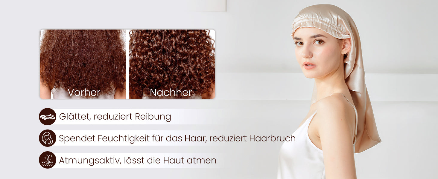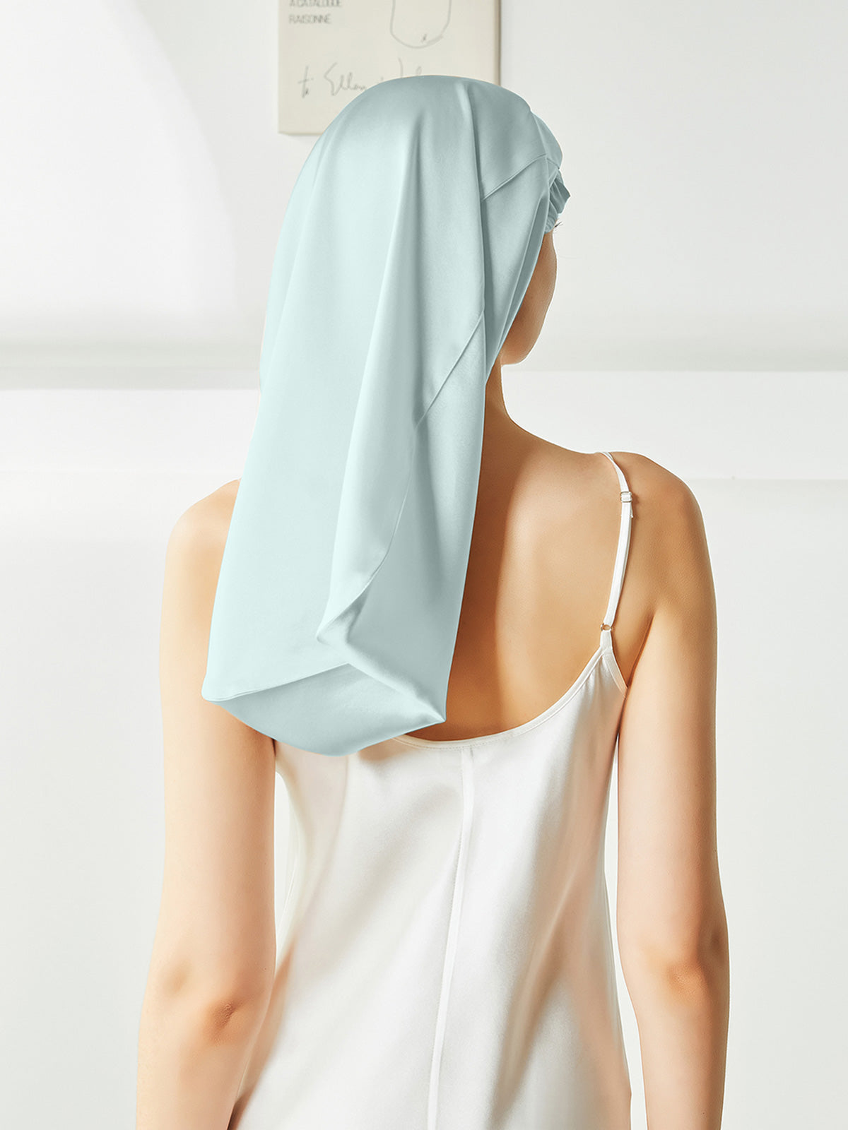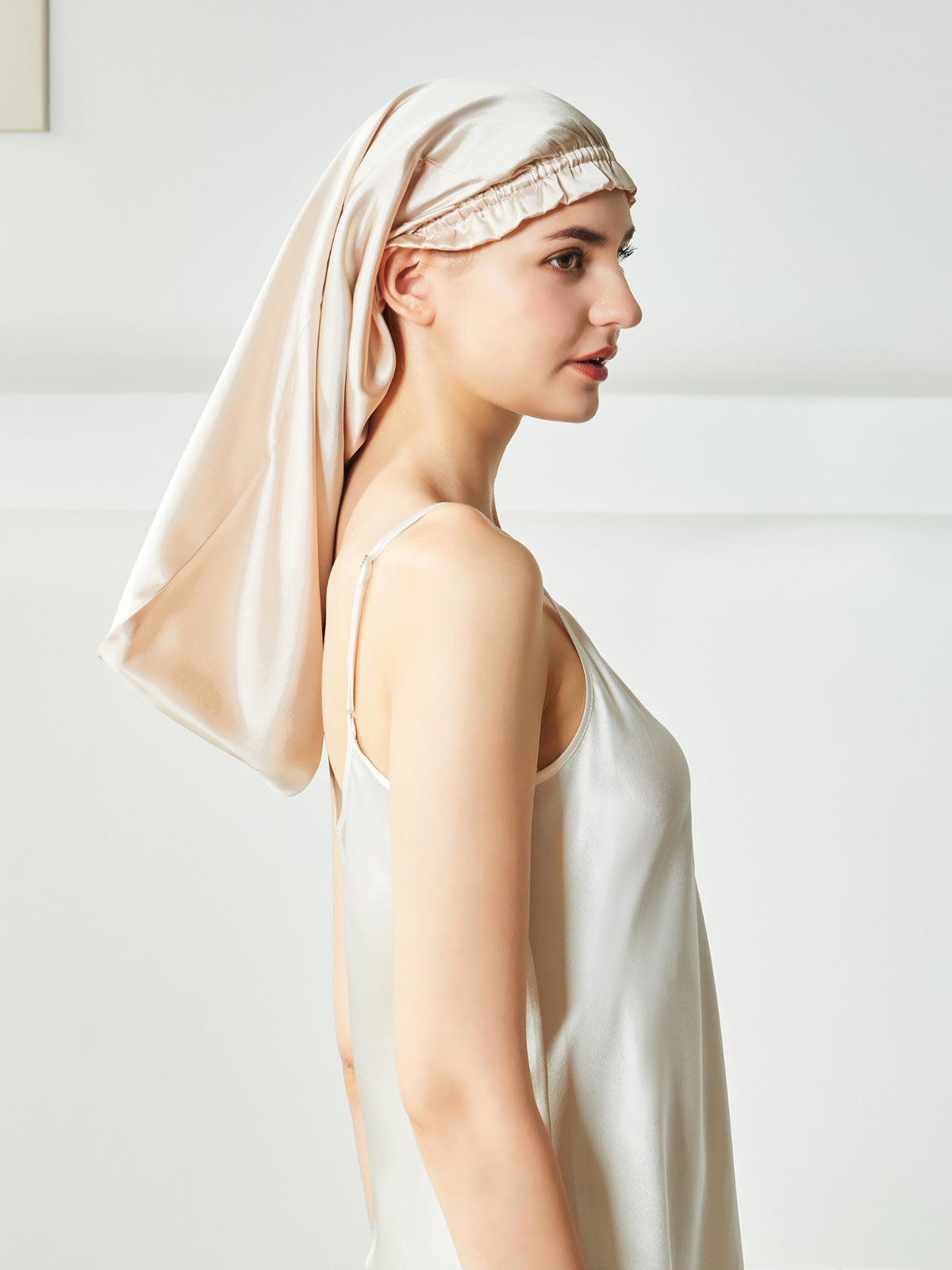Dies ist eine lange Schlafhaube aus Seide. Sie können Ihr langes Haar ganz entspannt in die Nachthaube stecken, anstatt es wie die kurze Nachthaube auf dem Kopf zu falten, können Sie es vor dem Schlafengehen einfach auf dem Kopf tragen. Seide kann das Haar effektiv mit Feuchtigkeit versorgen, es vor Kräuseln schützen und ist gut für das Haar.