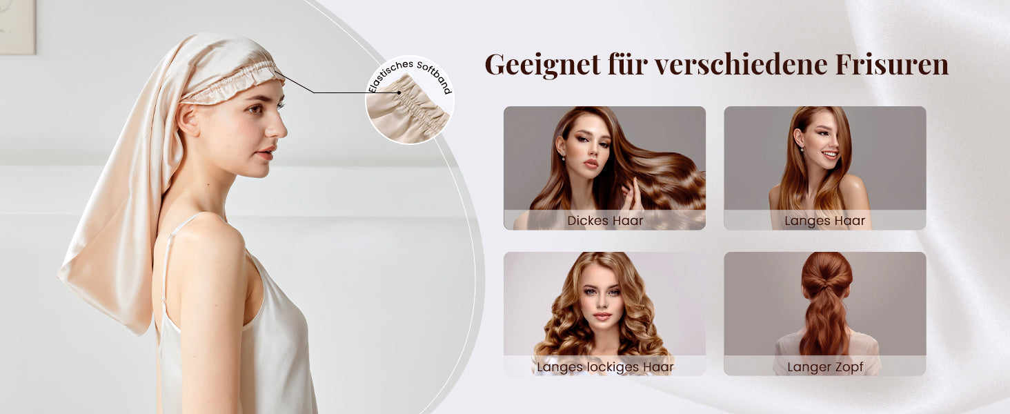 Mit Seide umwickeltes, angepasstes Gummiband, um ein Abrutschen beim Schlafen zu verhindern. Geeignet für lange Zöpfe/lockiges/bequemes Haar.