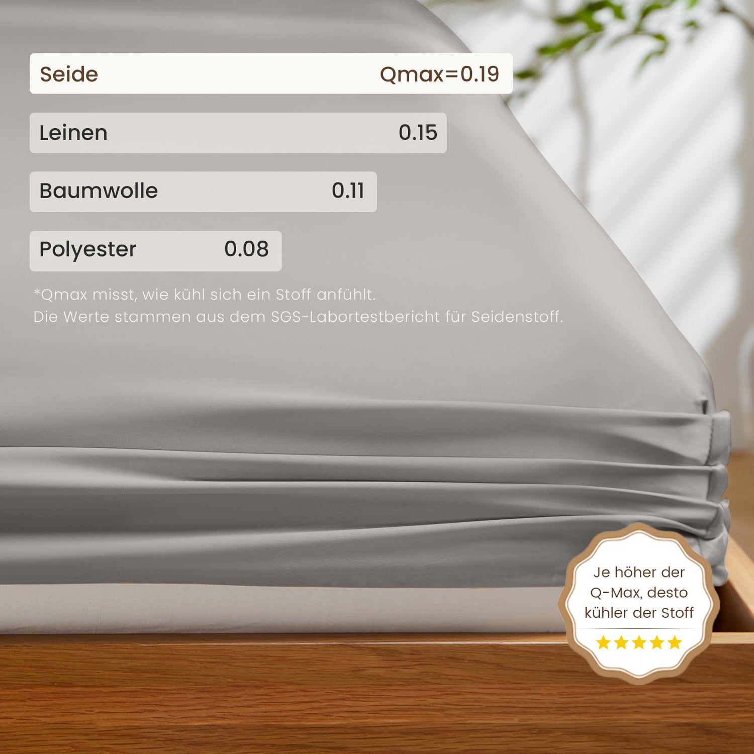 Erleben Sie die sofortige, spürbar kühle Empfindung von reiner Maulbeerseide. Mit einem hohen Q-Max-Wert leiten unsere Bettlaken die Körperwärme bei Hautkontakt sofort ab und sorgen so vom ersten Moment an für ein erfrischend kühles und angenehmes Schlafgefühl.